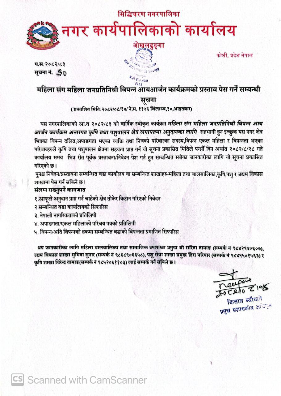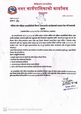 महिला सँग महिला जनप्रतिनिधि विपन्न आयआर्जन कार्यक्रमको प्रस्ताव पेस गर्ने सम्बन्धी सूचना