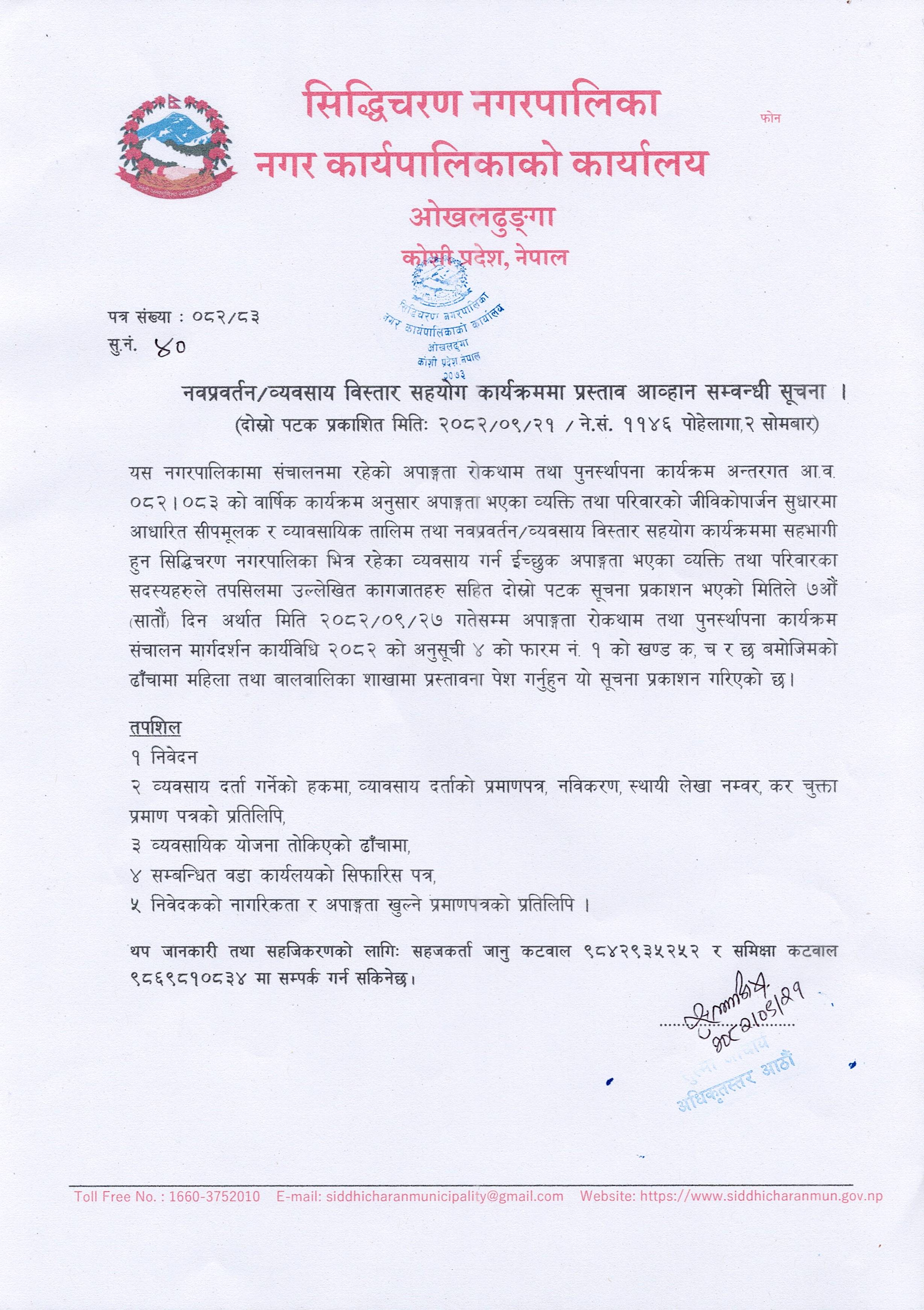 नवप्रवर्तन/व्यवसाय विस्तार सहयोग कार्यक्रममा प्रस्ताव आव्हान सम्बन्धी सूचना