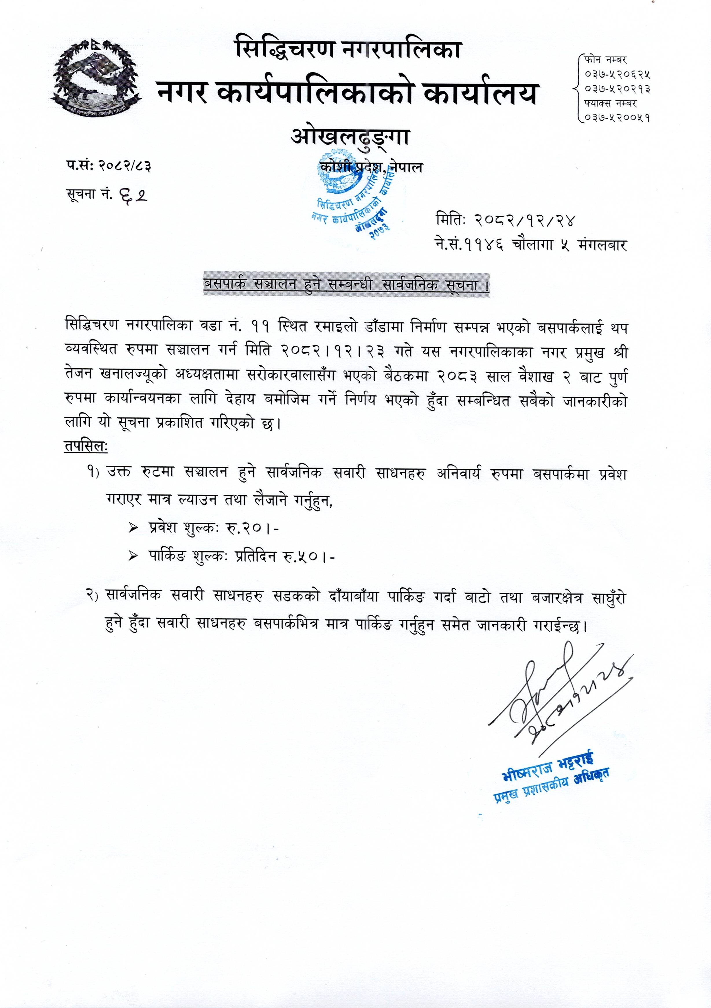 » बसपार्क सञ्चालन हुने सम्बन्धी सार्वजनिक सूचना