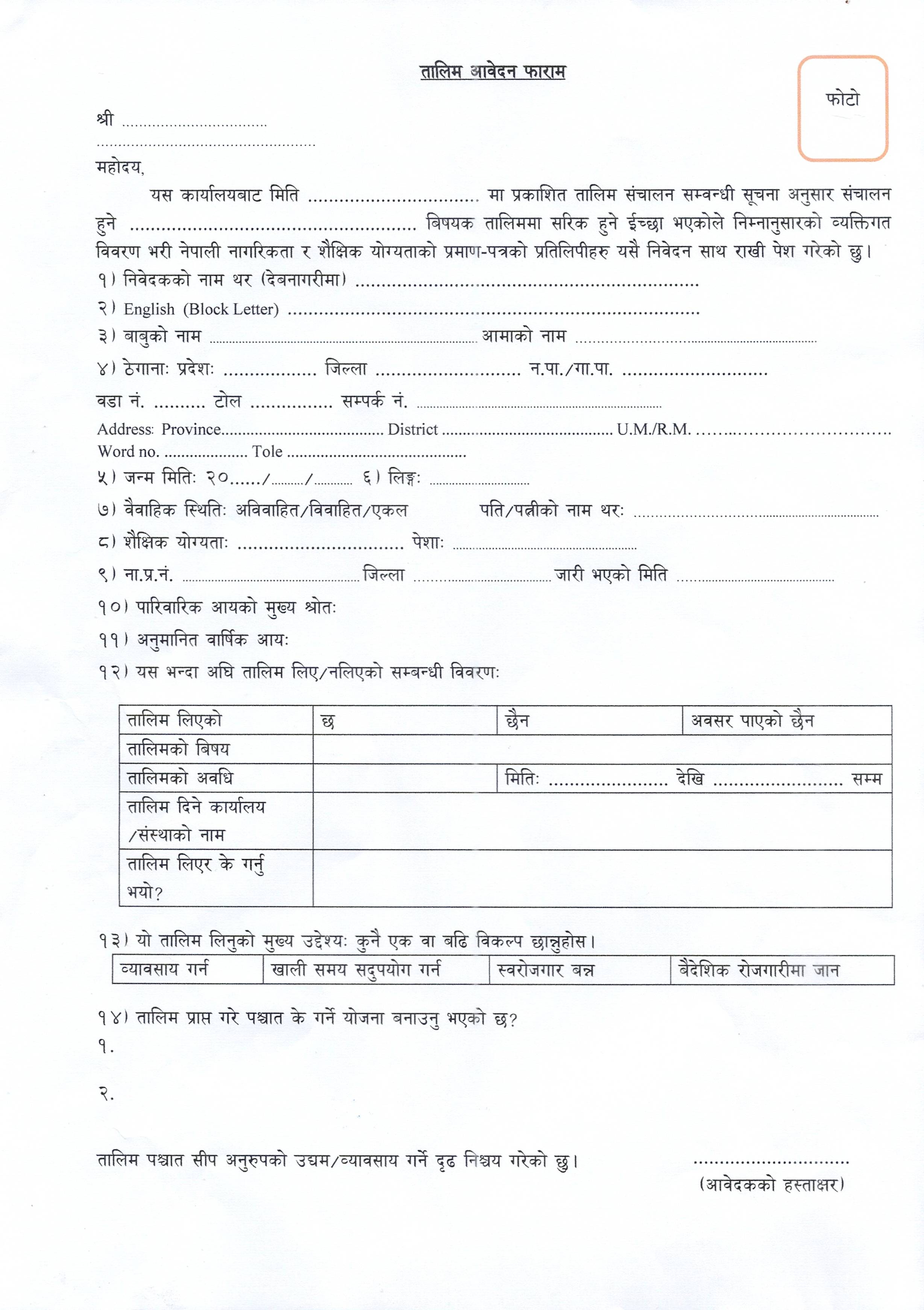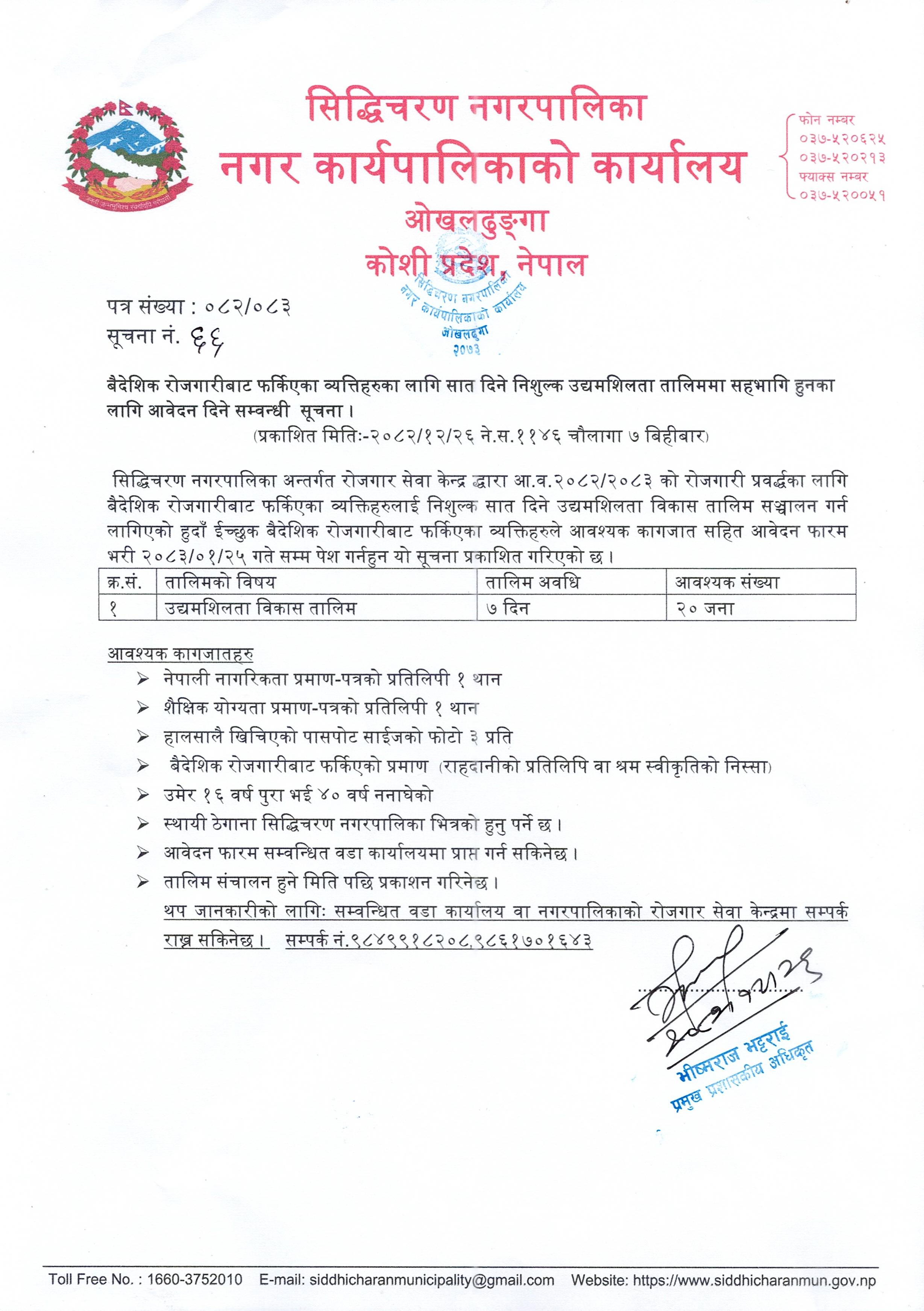 बैदेशिक रोजगारीबाट फर्किएका व्यक्तिहरुका लागि सात दिने निशुल्क उद्यमशिलता तालिममा सहभागी हुनका लागिआवेदन दिने सम्बन्धी सूचना