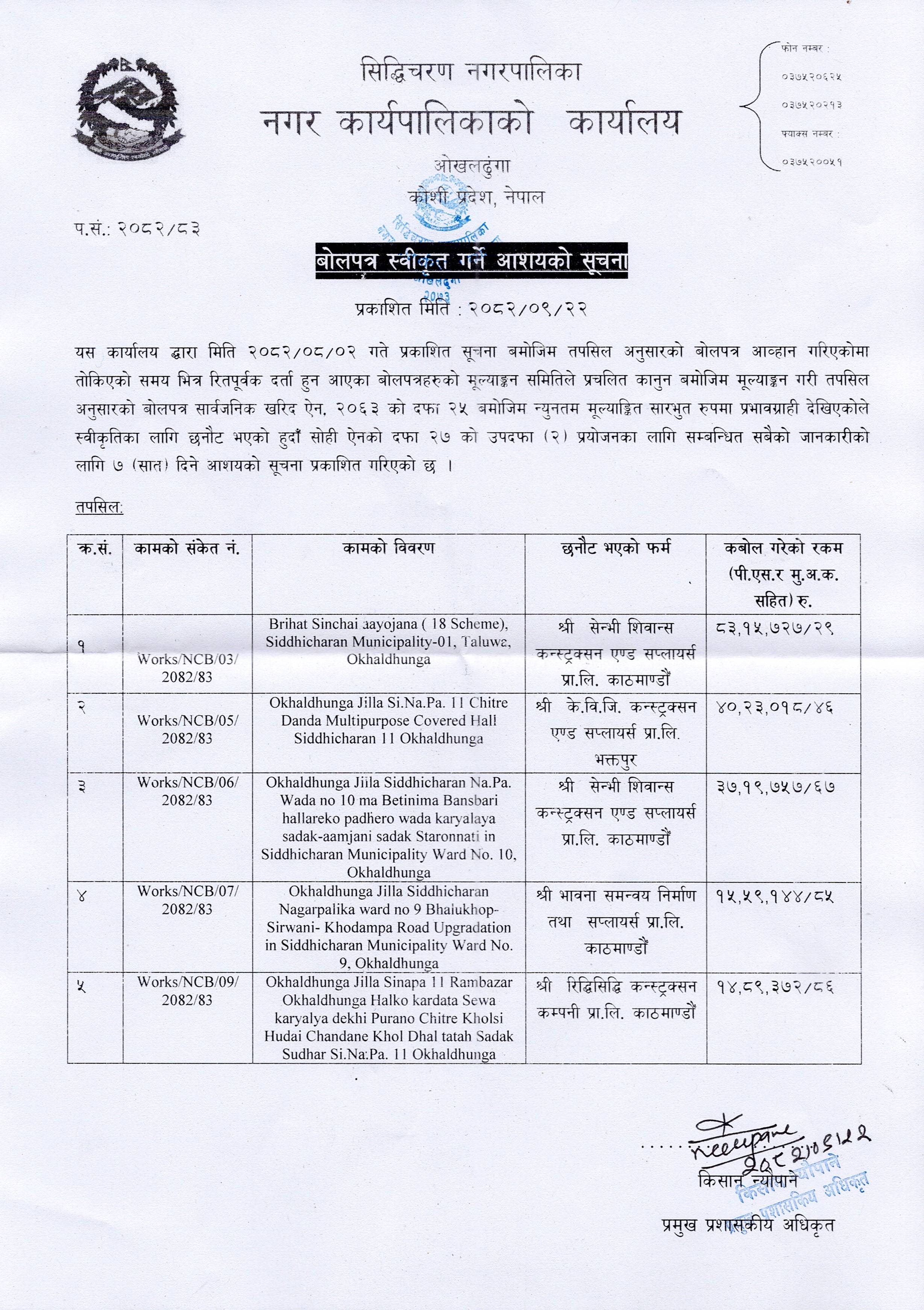 बोलपत्र स्वीकृत गर्ने आशयको सूचना Works/NCB/04/2082/83