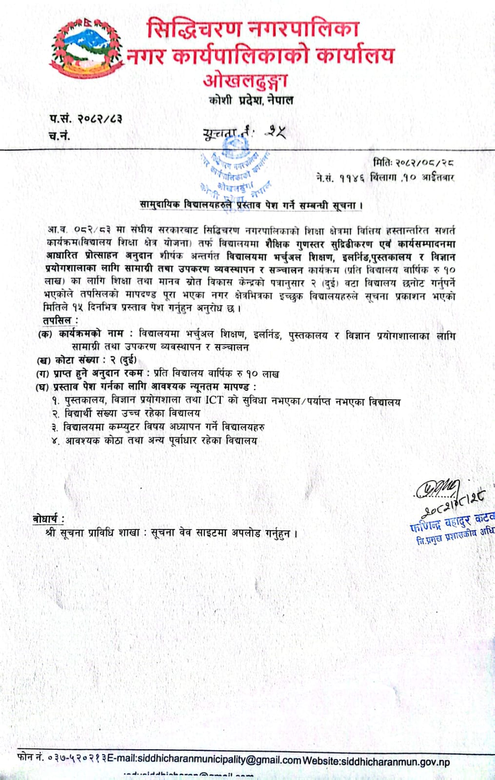 सामुदायिक विद्यालयहरुले प्रस्ताव पेश गर्ने सम्बन्धी सूचना