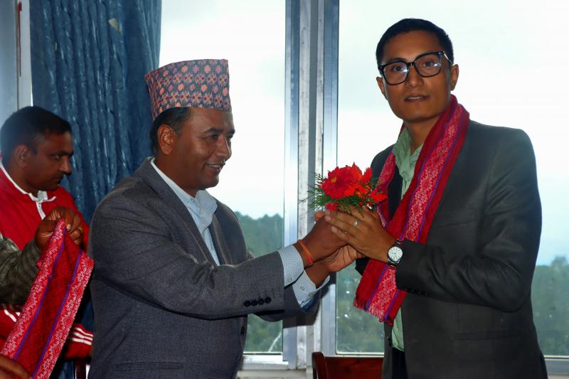 ओखलढुङ्गा जिल्लामा सरुवा भई आउनुभएका प्रमुख जिल्ला अधिकारी श्री मेखबहादुर मंग्रातीज्यूलाई स्वागत गर्नुहुँदै नगर प्रमुख श्री तेजन खनालज्यू